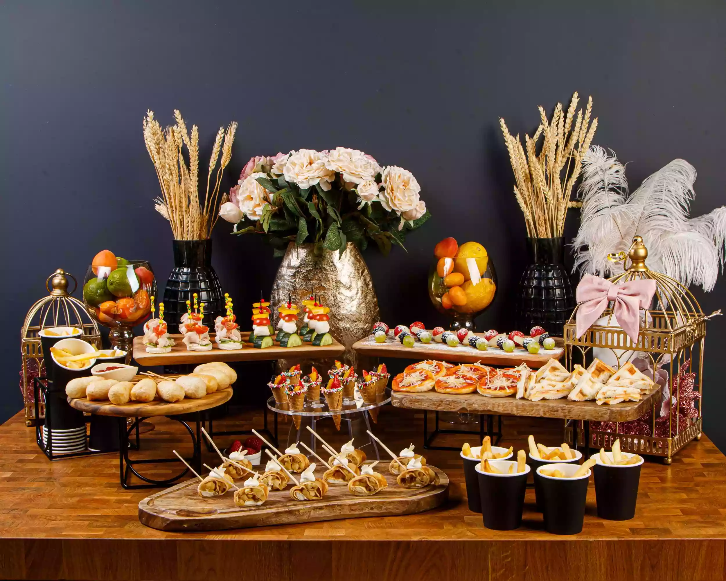 Подачу фруктов можно дополнить мармеладом, свежеиспечёнными пирогами, пирожными «макаронс», шоколадными конфетами, пудингами, желе, капкейками, маффинами, желе. При заказе торта стоит учитывать, что стандартная порция десерта на одну персону составляет около 150-200 граммов.